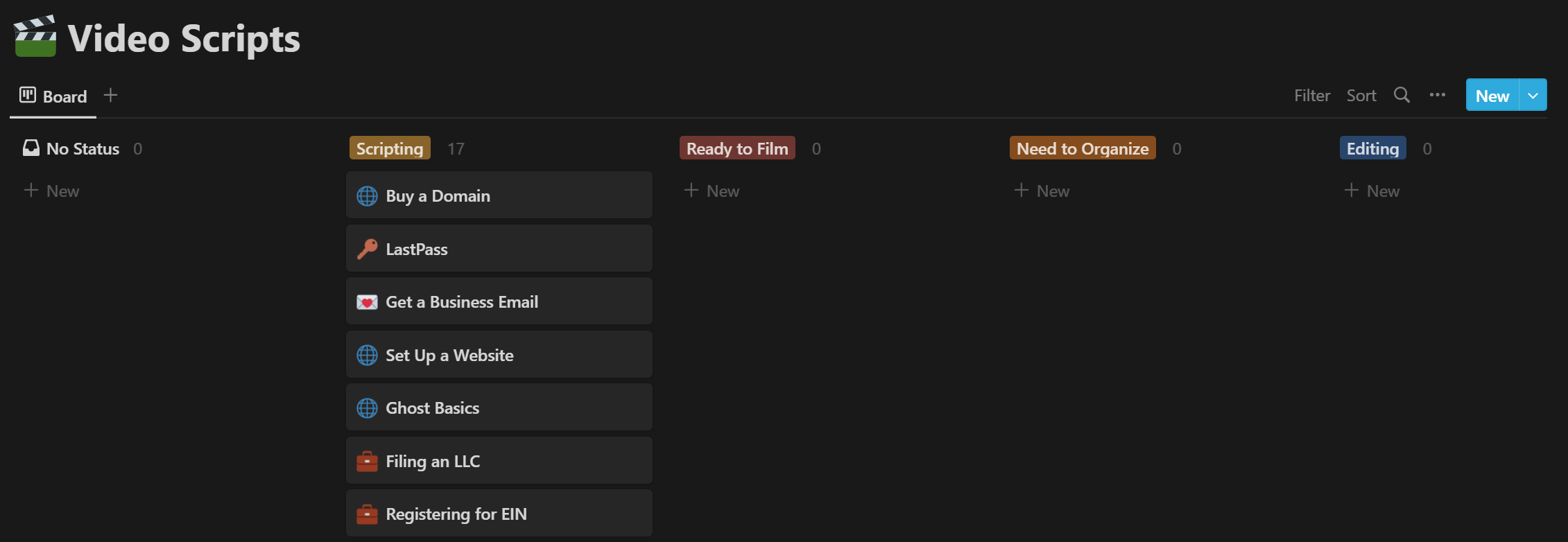 I like to set up a KanBan-style board on Notion. Each "card" is a 4-5 minute video. As I work on each video it moves along. I have found this keeps my online classes super organized.