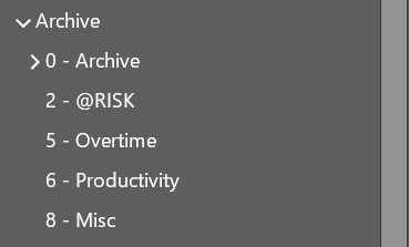 Email is a bit trickier. I have all my projects listed out and once they are finished, I archive them. The #'s you see are not random - they are hotkeys. If I want to move an email to the 5 - Overtime folder I press Ctrl+5 and ๐ฅbam๐ฅ it moves it for me. I set that up using Quick Steps in Outlook.