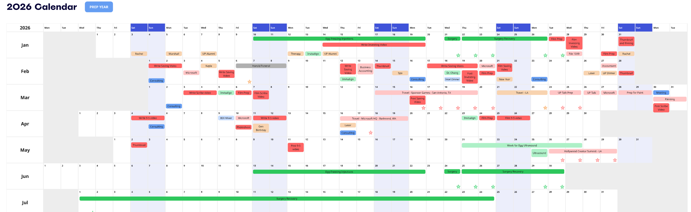 On my calendar, the green bar below represents egg freezing. In Q1, notice how little recovery time I allowed. In Q2, notice how intentional that buffer is now.